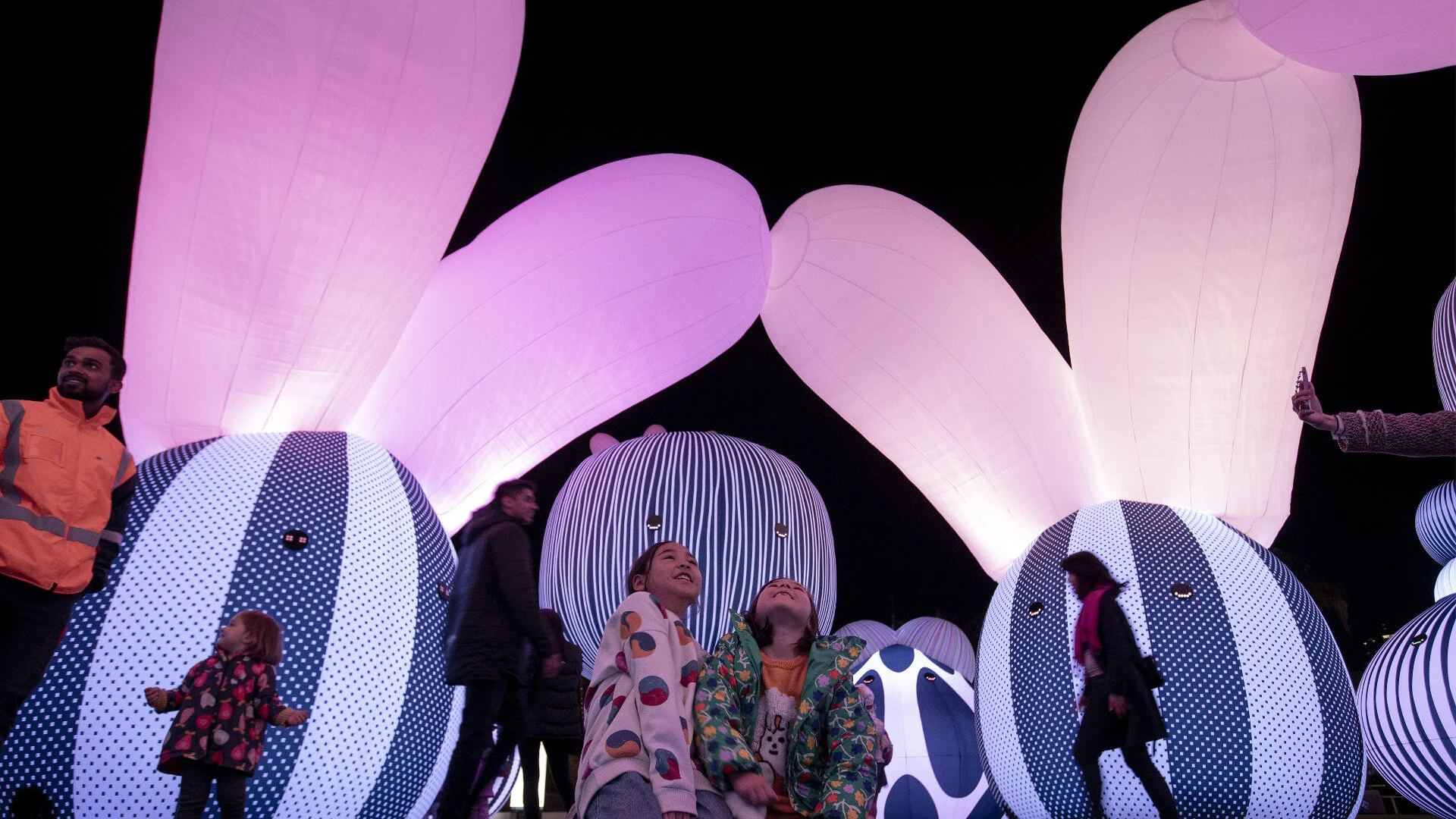 In full, our custom light installation showcases 16 inflatables (some up to six metres) extending over a 500 square metre area. The sound experience is its own spatial environment, immersing visitors in an arresting score written character-by-character for a full choir. The generative soundscape synced with light, creates an adventure that is aesthetically dynamic both day and night.